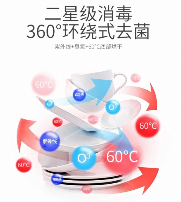 一星級消毒標準:能殺死大腸桿菌等具有代表性的菌種。臭氧消毒時,消毒柜內臭氧濃度應大于等于每立方米20毫克,消毒時間30分鐘左右。高溫消毒時,消毒柜內消毒溫度應大于等于100攝氏度,消毒時間15分鐘左右。
